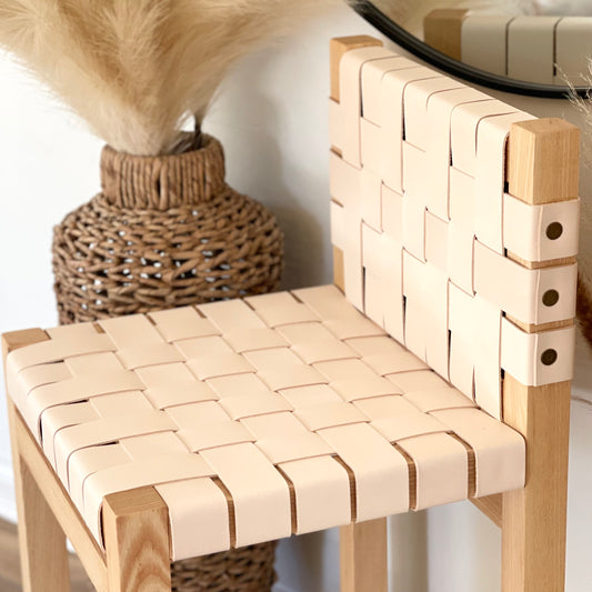 Double Woven Leather Counter Stool with Back in Natural Oak-Tanned Leather